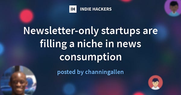 Channing Allen at Indie Hackers produced a good post earlier this month on some successful newsletter-only startups, such as The Hustle, which makes $10m+ and the Morning Brew, which makes $13m in ad revenue. He also mentions a new #OpenStartup Mailbrew, a platform where you can create your own customized mailing list from sources including Twitter, Hacker News, Reddit and now it seems Substack as well. Read the full post here.